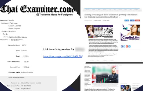 An account and proforma invoice for $250 to have a sponsored article prepared by the Examiner PR Bureau. Payment of the invoice is on the basis that the final article remains the property of the Thai Examiner which retains copyright and full editorial control over the piece. - All Thai Examiner articles are subject to strict quality control principles to preserve the integrity of the Thai Examiner, the reputation of the sponsor and the trust between our publication and its readers. To find out more, please visit our guide to Thai Examiner sponsored articles and Examiner PR Bureau service: