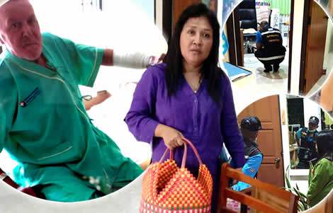 The 70-year-old German man was recovering in hospital in Phuket on Friday following his ordeal after doctors had bandaged and treated his left arm from the injuries suffered including the 12 cm gash to his left-hand received as he tried to fight off the intruders before his wife returned.