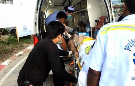 Rescue services remove the badly injured German man named as 63 year old Helmut Prock to Patong Hospital after he was hit by a boat off a beach in Katu, Phuket.