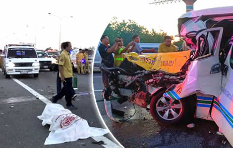 Police believe that the 33-year old driver of the passenger van, named as Saroj Khlabkhlai, fell asleep at the wheel causing the van to hit the rear of the truck carrying steel rods. The accident occurred at approximately 5.30 am.