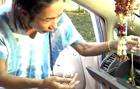 38-year-old Wandee Changtet from Suphan Buri at the scene of the car where her husband was last seen in Uthai Thani on May 22nd. She retrieved gold and cash from the vehicle, a gold sedan which police earlier found to be registered in her name. Her 64-year-old Dutch husband, Friedrich Reinhard Marcel Stoffel, could not be found and had only taken his blood pressure pills from the car.