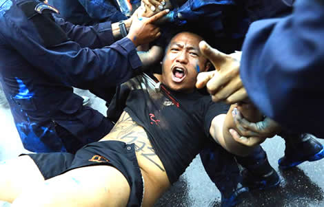 Mr Jatupat Boonpatararaksa or Pai Doadin was tackled by riot police and forcefully taken away into custody along with 20 other participants in the fracas with police in which blue paint was sprayed at officers.