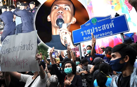Following the crackdown and suppression of the anti-government protest early on Thursday morning, fresh disturbances broke out in Bangkok on Thursday evening as a new protest rally took place near the scene of yesterday’s large march on Government House. The crowd at the gathering were told that key protest leaders had been denied bail at a court sitting while there were reports that human rights lawyer and key leader, Arnon Nampa, had been taken by police helicopter to face legal proceedings in Chiang Mai reportedly in connection with sedition charges against him.