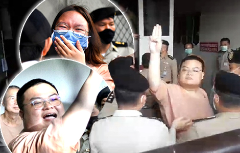 Chaotic scene in the courtroom as protest supporters erupted and key leader Ms Panusaya Sithijirawattanakul rushed to embrace Mr Parit