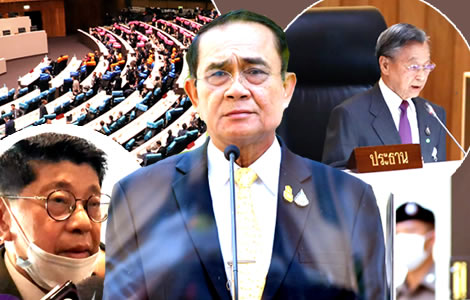 Prime Minister Prayut Chan ocha signalled this week that he was easy about the course of events in parliament where moves have floundered to amend the 2017 constitution despite what appeared to be a parliamentary victory for the opposition but which has left the government in a stronger position. At the end of the week, Deputy Prime Minister Wissanu Krea-ngam (inset bottom left) announced that he had agreed with the President of the Parliament, Chuan Leekpaii (inset top right), to postpone a parliamentary session as the Council of State reviewed alterations to the government-sponsored referendum bill which would provide for a constitutional referendum to be put to the public but which still faces an uncertain fate.