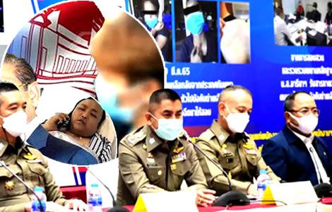Scene from the press conference yesterday in which senior Thai police including Police Lieutenant General Surachate Hakparn, flanked by a high ranking officer with the Cambodian Police, revealed that an investigation into the sensational claims made by a Thai woman on her return from Cambodia on Wednesday, March 9th last, were entirely false and created by the woman and her boyfriend to elicit the cooperation of authorities in both kingdoms and a quick rescue from criminal elements in Cambodia where the woman had travelled to in early 2021 to work on a voluntary basis.