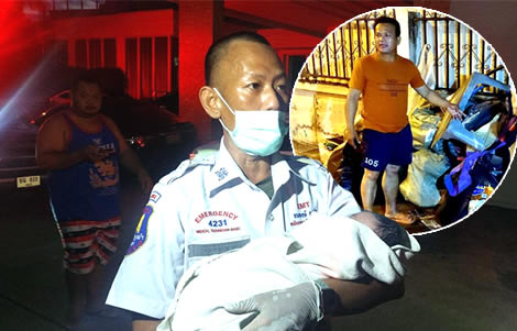 A volunteer with Pattaya’s Sawangboriboon Thammasathan Foundation holds the newborn baby before being taken to hospital on Sunday morning. (Inset) 54-year-old Mr Surachai Kaewpha indicates where he found the child while walking his dog in the Bang Lamung area of Pattaya.