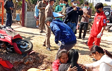 The motorbike, a red Honda PCX model used by female drivers, registration No 4991 Roi Et and was relatively new before the accident but was badly damaged with debris from it strewn near the remains of the foreign man.