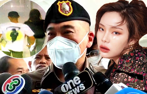 Police Lieutenant General Thiti Saengsawang briefing the press on Thursday as the investigation into the apparent murder-suicide proceeds. (Inset left) The couple entered the upmarket apartment in Asoke at approximately 4.30 am on the 18th of April with 18-year-old Phumpat Chaiwanichaya or Ikkyu carrying a package and a death scythe image on his T-Shirt. (Right) 22-year-old Ms Supitcha Preedacharoen or Gigi was a social media star with over two hundred thousand followers.