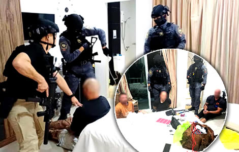Scenes from a raid last weekend by Hanuman commandos on an apartment in Pattaya. Four men were arrested, including two UK nationals, a French man and one from New Zealand. They face charges including illicit drug possession, firearms offences and attempting to obtain money through deception.