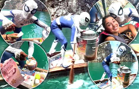 The clip was made by a party of excited Western tourists. The footage shows Spiderman on the water guiding his craft alongside tourist boats. He is subsequently seen fist-bumping and interacting with delighted tourists.