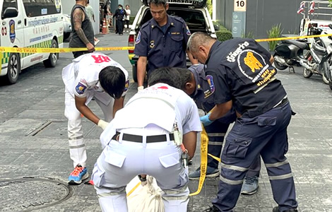 Police and rescue teams respond quickly to high-rise fall in Pattaya as authorities secure the scene seeking clues