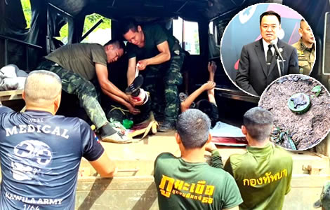 The injured soldiers were identified as Sergeant Major First Class Therdsak Samaphong, who lost his right foot; Private Wachira Panthana, who suffered chest injuries from the shock wave; Private First Class Aphirak Srichomchai, who was struck in the leg by shrapnel; and Private First Class Anucha Sujaree, who suffered eye irritation from dust and chemicals. They were treated in the field before being airlifted to Sunpasitthiprasong Hospital in Ubon Ratchathani.