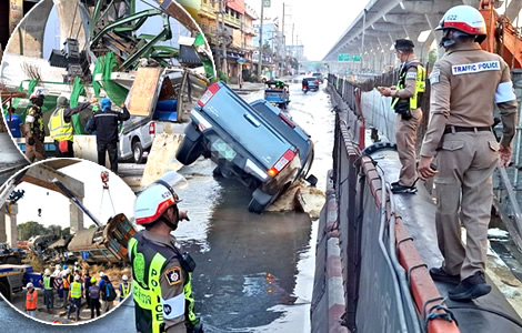 A Toyota pickup on Saturday morning was rescued by Highway Police on the notorious Rama II motorway project in Samut Sakhon. On Thursday, the same project claimed two more lives when a crane collapsed, injuring five. The toll since 2018 now stands at 144 dead and over 1,400 injured. Just 24 hours earlier, 32 people died when a crane crushed carriages on the Thailand–China high-speed rail line. These disasters follow the 2025 skyscraper collapse after an earthquake and a massive Bangkok sinkhole. The failures deepen doubts about Thailand’s reliability and safety abroad. The country faces another blow to its battered image.