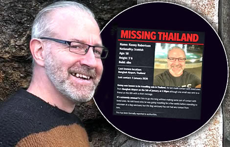 Search launched for missing Scots traveller Kenny Robertson, 58, who vanished after landing in Bangkok on January 5. Last contact was a brief email days later. Family, officials and expat communities across Thailand are appealing for information.